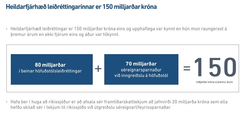 Í kynningu á Leiðréttingunni, stærsta máli ríkisstjórnar Sigmundar Davíðs Gunnlaugssonar, sem fram fór í Hörpu í mars 2014 kom fram að heildarumfang hennar yrði 150 milljarðar króna. Þar af áttu 70 milljarðar króna að koma til vegna þess að landsmönnum yrði gert kleift að nota séreignasparnað sinn skattfrjálst til að borga niður húsnæðislán sín í þrjú ár, frá miðju ári 2015 og fram til 30. júní 2017.