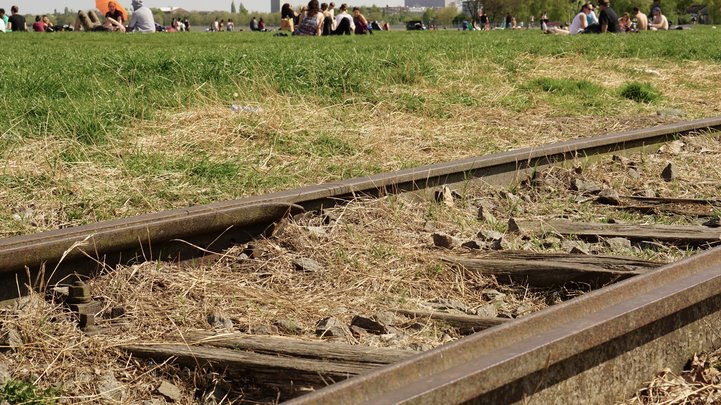Við fyrstu sýn virðist þetta vera venjulegur staður þar sem fólk safnast saman en þegar betur er að gáð má sjá leifar af gömlum tíma. Að rekast á gamla lestarteina í miðjum garði vekur upp margar spurningar. Eru þetta teinar sem notaðir voru fyrr á síðustu öld, í stríðinu eða hvað? Við fáum engin svör en það gerir þá enn forvitnilegri fyrir vikið.