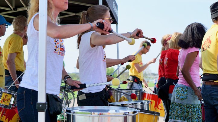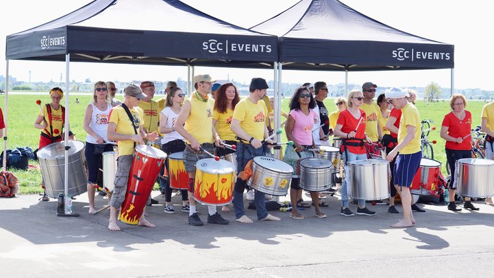 Á góðum degi má heyra tónlist og góðan trumbuslátt. á Tempelhof . Þarna var trommað fyrir maraþonhlaupara til þess að hvetja þá áfram. Ryþminn sest í blóðið og fylgir okkur það sem eftir lifir dags.