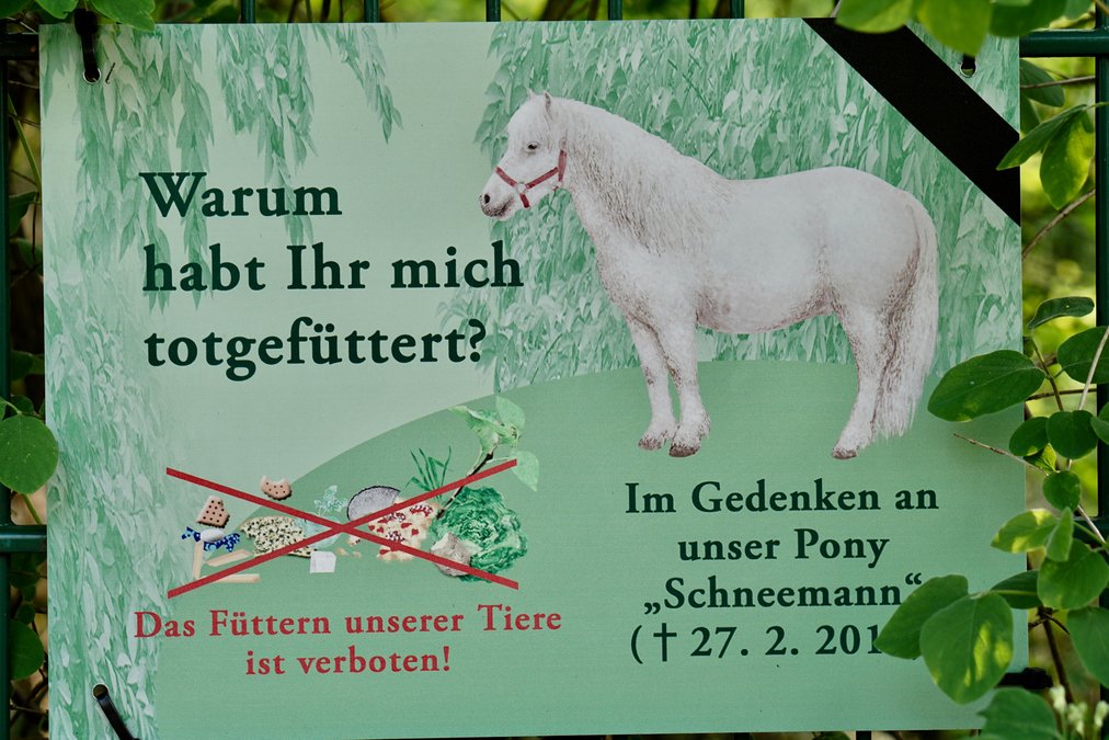 „Af hverju drápuð þið mig?“ spyr þessi látni póní-hestur að handan. Einhver meðvitaður starfsmaður húsdýragarðsins í Hasenheide-garði hefur hengt þetta upp til að hreyfa við meðfæddu samviskubiti Þjóðverja.