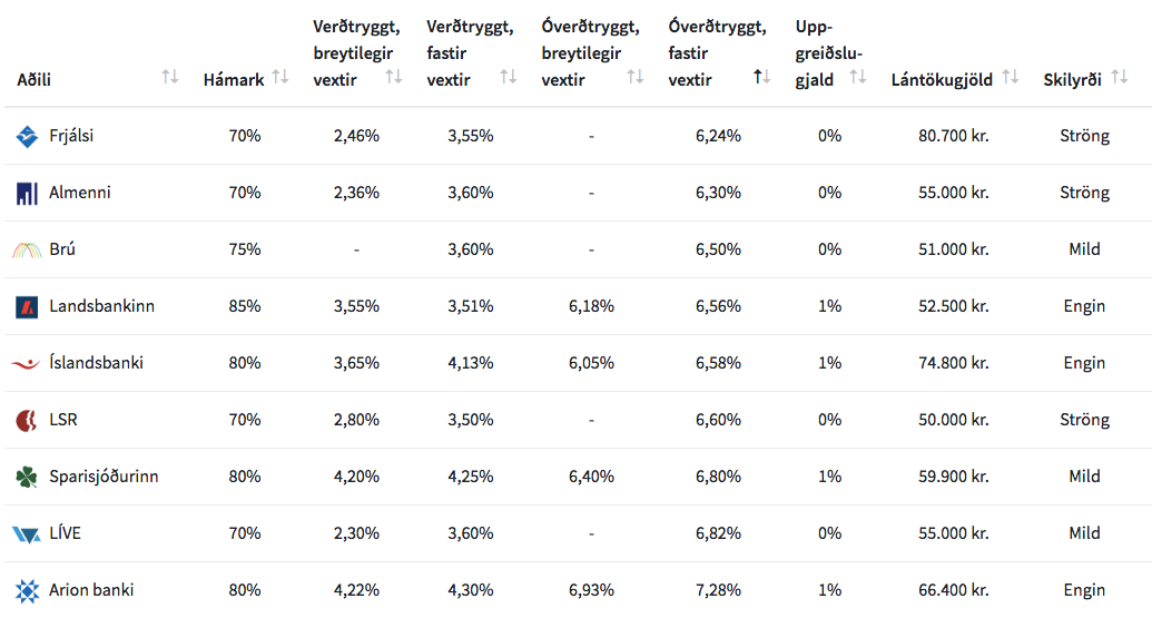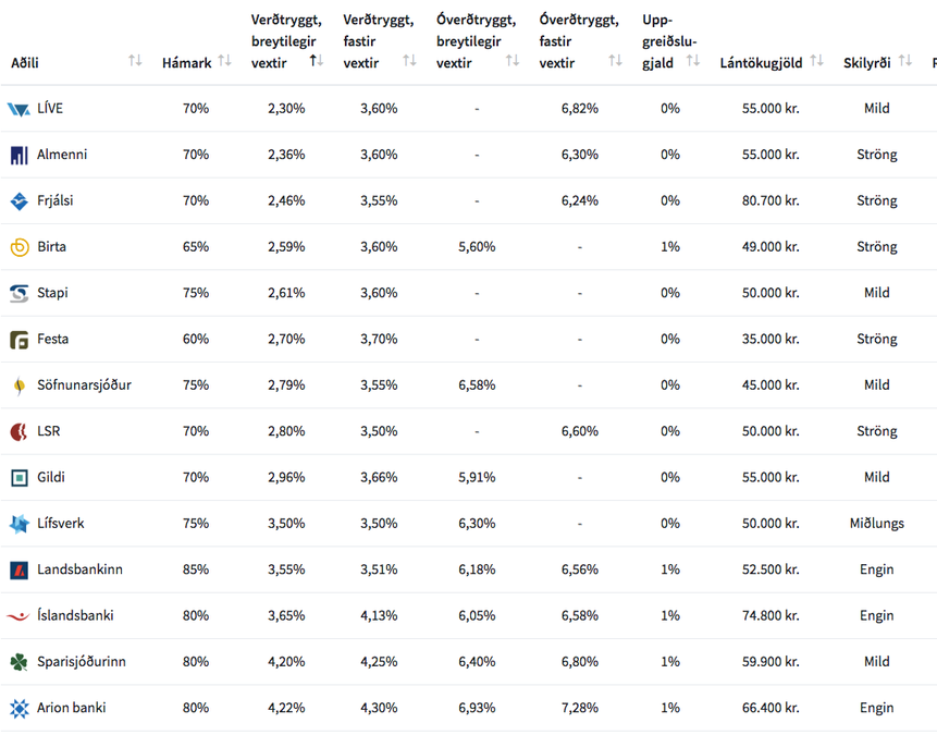 Dýrustu verðtryggðu breytilegu lánin eru hjá Arion banka, þar sem hægt er að fá lánað upp að 80 prósent af kaupverði á 3,89 prósent verðtryggðu breytilegu grunnláni og viðbótarláni á sama formi með 4,99 prósent vöxtum. Þegar bæði lánin eru lögð saman skilar það breytilegum vöxtum upp á 4,22 prósent verðtryggt, samkvæmt útreikningum heimasíðunnar Herborg.is, sem ber saman þau kjör sem bjóðast á íbúðalánamarkaði.