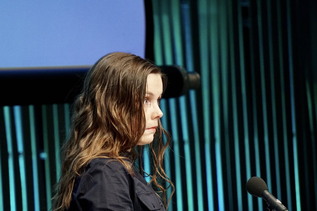 Salurinn er dimmur en lýsingin þó mjúk. Bláleitir tónar flæða um rýmið og minna einna helst á útfjólublá ljós sólbaðsstofa eða „blacklight“-ljós dansstaða níunda áratugarins. En hér er engin diskókúla að snúast og það ríkir bókstaflega grafarþögn. Viðstaddir, nokkrir blaðamenn og ljósmyndarar, spjalla smávegis sín á milli hálfum hljóðum.