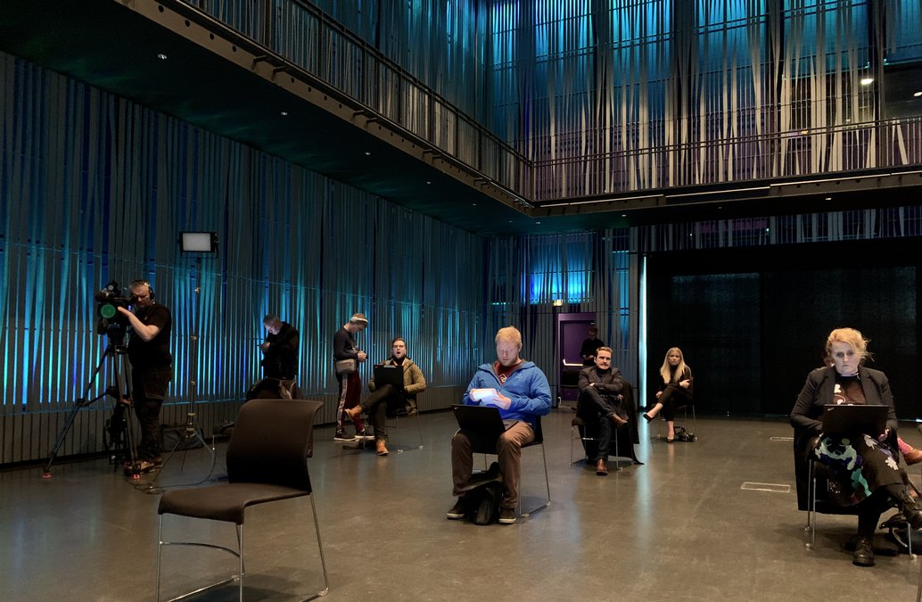 Norðurljósasalurinn á annarri hæðinni er í fyrstu þrunginn þögn. Óvenjulegur blaðamannafundur er í uppsiglingu. Um gólfið er búið að raða stólum á víð og dreif, allt eftir kúnstarinnar reglum sóttvarnalæknis.