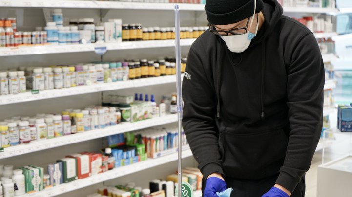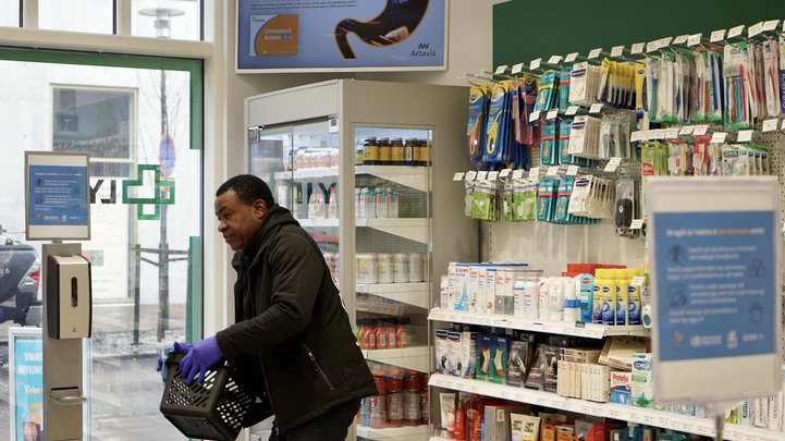 Í apótekinu er vel tekið á móti okkur. Þar má finna hitt og þetta sem er gott og jafnvel ráðlegt að eiga. Lyfjafræðingarnir halda sér í öruggri fjarlægð, viðræðugóðir og hlýlegir. Sérstakt sprittteymi sér um að spritta og þrífa fyrir viðskiptavini. Tveir menn sem mæta nú í apótekið tvisvar í viku til að spritta.