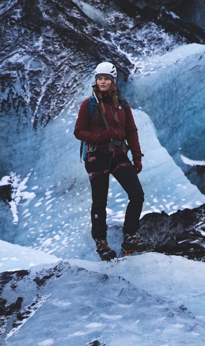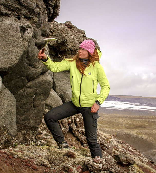 Helga, sem er vön fjallgöngum og jöklaferðum, segir sýnatökuferðirnar á Öræfajökul og eldfjöllin á Jan Mayen, allt annað en auðveldar. „Ég þarf að príla utan í klettum með bakpoka. Og það er ekki þannig að bakpokinn léttist eftir því sem líður á gönguna og ég borða meira af nestinu. Hann þyngist bara af grjóti. Í lok dags er ég kannski með þrjátíu kíló á bakinu.“