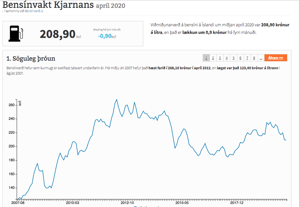 Þrátt fyrir þessa miklu lækkun á heimsmarkaði þá hefur bensínverð hérlendis svo gott sem staðið í stað milli mánaða. Viðmiðunarverð á bensíni samkvæmt Bensínvakt Kjarnans fer úr 209,8 krónum á lítra í 208,9 krónur á lítra. Hlutdeild olíufélaganna í hverjum seldum lítra fer úr því að vera 18,52 prósent í mars í að vera 32,96 prósent í apríl. Hún hefur aldrei verið hærra en lægst fór hún í tæplega ellefu prósent í júní 2009.