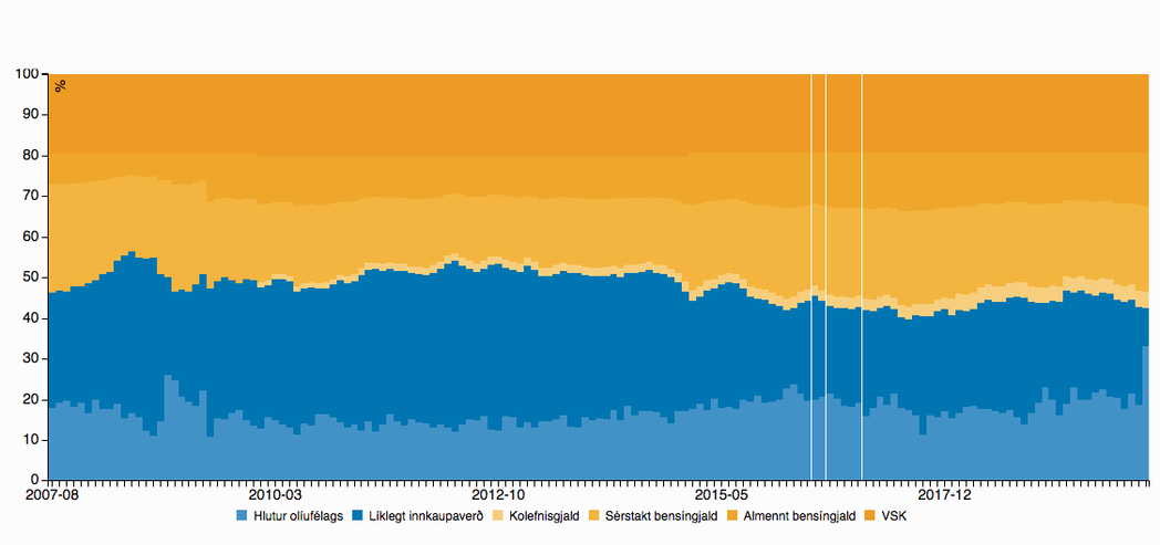 Samanlagt fór því 120,12 krónur af hverjum seldum lítra til ríkisins, eða 57,5 prósent. Hæstur fór hlutur ríkisins í 60,26 prósent í júlí 2017.