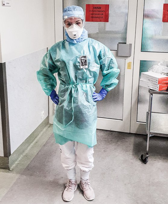 Allt heilbrigðisstarfsfólkið er með grímur fyrir vitum og gleraugu fyrir augunum. „Og það getur verið vont fyrir sjúklinga að geta ekki séð brosið mitt og almennilega greint svipbrigðin mín. Það skiptir máli þegar maður þarf að ná persónulegum tengslum. En við höfum verið að reyna að hugsa í lausnum og núna límum við mynd af okkur framan á búninginn þannig að fólk getur þá séð hvernig við lítum út undir grímunni. Sjúklingarnir geta þá líka þekkt okkur í sundur – svo að við séum ekki öll bara grænar geimverur.“