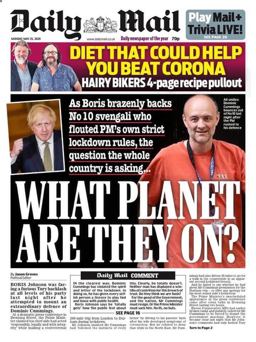 Á forsíðu the Daily Mail í dag segir einfaldlega: „Á hvaða plánetu eru þeir?“ Þar er átt við Johnson og Cummings. Í tilvísun í leiðaraskrif blaðsins á forsíðunni segir að Cummings hafi á mjög skýran hátt brotið gegn útgöngubanninu. „Með því að gera það þá hefur hann gefið hverri einustu sjálfselsku manneskju leyfi til að leika sér að heilsu almennings.“ Í kjölfarið er farið fram á afsögn Cummings. Fáist hún ekki þurfi Johnson að reka hann og svo er vitnað í fræg ummæli forsætisráðherrans um Brexit, þar sem hann sagði ítrekað „no ifs or buts“, það þyrfti að klára þá útgöngu.