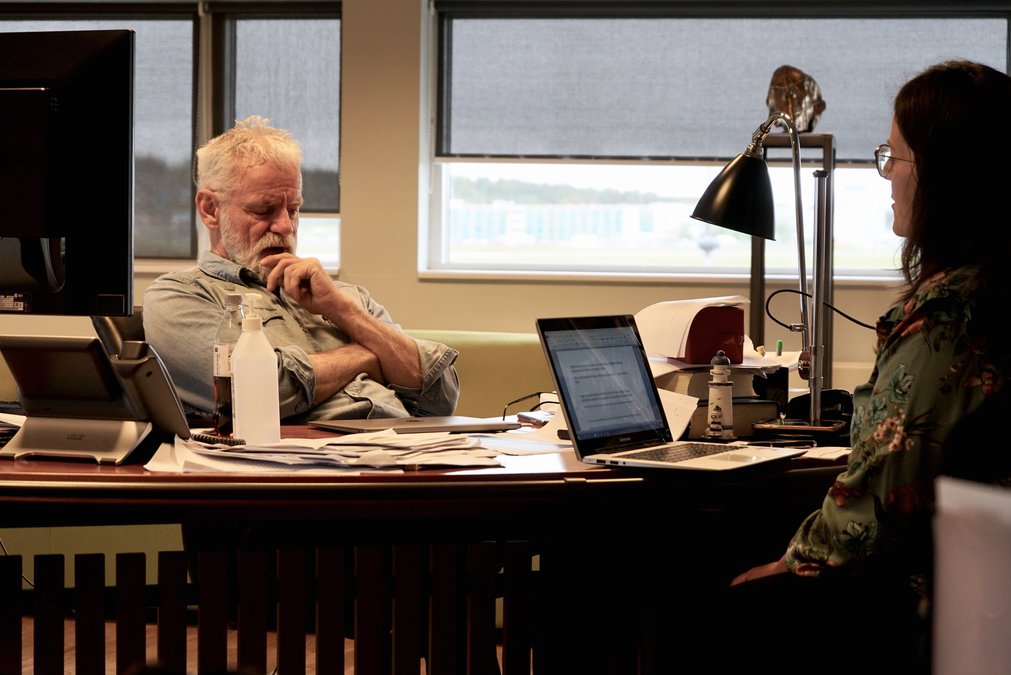 Skrifstofa Kára Stefánssonar er á þriðju hæð í húsnæði Íslenskrar erfðagreiningar í Vatnsmýrinni. Þaðan er útsýni í tvær áttir og á miðri skrifstofunni situr Kári við skrifborð sitt, umkringdur bunkum af blöðum og bókum.