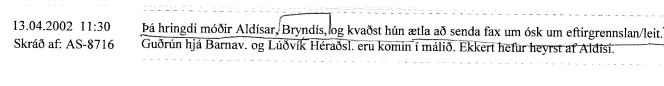 Einnig segir í færslu úr dagbók lögreglu, 13. apríl árið 2002, að Bryndís Schram hafi hringt í lögreglu og sagst ætla að senda fax með ósk að eftirgrennslan eða leit að dóttur sinni. Þann sama dag sætti Aldís handtöku, í kjölfar þess að hún tilkynnti meint kynferðisbrot Jóns Baldvins til lögreglu.
