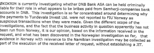 Sú skýring stangast á við tölvupóst DNB til fjármálastjóra Samherja á Kýpur 9. desember 2019, sem rakinn var hér að ofan. Bréf Økokrim til namibískra yfirvalda dagsett 29. apríl 2020 sýnir líka svart á hvítu að rannsókn norsku efnahagsbrotadeildarinnar snýst um þátt DNB í því að tilkynna ekki greiðslur frá félögum Samherja til Tundavala.