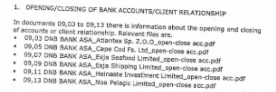 Í skjölunum má finna upplýsingar um það hvernig bankaviðskiptum DNB við fjölda félaga í eigu Samherja var lokið. Hægt er að sjá nöfn þeirra félaga hér að neðan.
