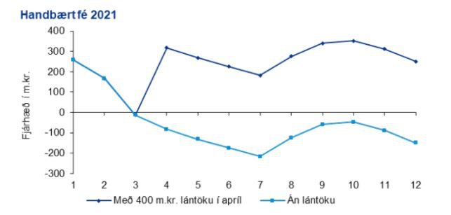 Ef ekki yrði tekið 400 milljón króna lán núna á næstu mánuðum yrði sjóðstaðan hins vegar komin við núllið í mars og orðin neikvæð í apríl. Með lántöku í apríl er hins vegar gert ráð fyrir að sjóðstaðan verði jákvæð allt árið og standi í um 250 milljónum króna undir lok árs.