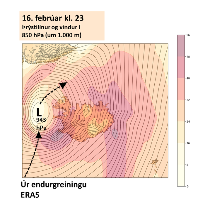 Staðsetning og dýpt lægðarinnar ber vel saman við samtímaveðurgreiningar þetta kvöld og lægsti loftþrýstingurinn mældist á miðnætti, 946,2 hPa á Galtarvita norðan Súgandafjarðar. Endurgreining óveðurslægðarinnar er því mjög trúverðug. Vindur er sýndur í 850 hPa hæð, sem með svo djúpri lægð reiknast í um 900-1.000 metra hæð. Það er einmitt vindur úr þeirri hæð sem slær sér niður undir yfirborð. Sjá má hring utan um rauðasta svæðið sem nær inn á Reykjanes með 48-56 m/s og annars suðvestanlands eru 42-48 m/s. Fátítt er að vindur í þessari hæð fari yfir 50 m/s almennt séð, en vindáttin og áhrif landslags og yfirborðs eru síðan ráðandi þættir fyrir raunvind í 10-50 m hæð yfir jörðu.