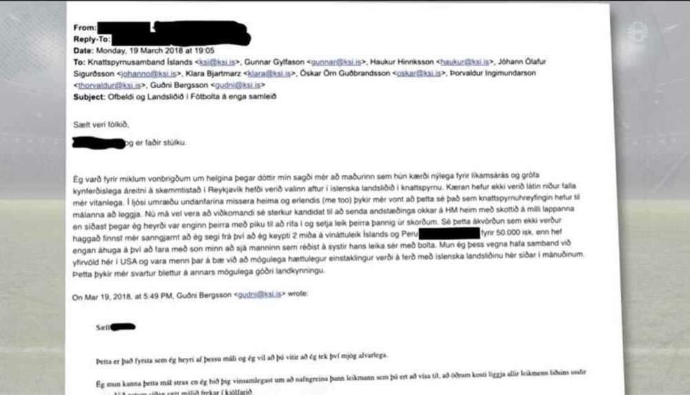 Hálfu ári eftir umrætt atvik ætlaði faðir konunnar að fara á vináttulandsleik. Þegar hann áttaði sig á að umræddur fótboltamaður væri í landsliðshópnum sendi hann starfsfólki KSÍ tölvupóst og greindi frá kærunni.