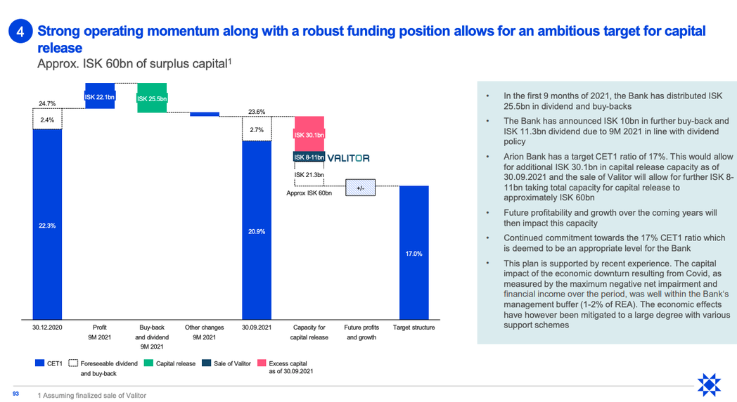 Í kynningu á markaðsdegi Arion banka, sem fór fram í gær, kemur fram að von sé á meiru. Miðað við markmið Arion banka um hvert eiginfjárhlutfall hans ætti að vera telja stjórnendur bankans hægt að losa um 30,1 milljarð króna til viðbótar til hluthafa án þess að fara niður fyrir þau mörk. Ef salan á greiðslumiðlunarfyrirtækinu Valitor til ísraelska fyrirtækisins Rapyd, sem ákveðin var í sumar, verður samþykkt af Samkeppniseftirlitinu eiga að losna á bilinu átta til ellefu milljarðar króna til viðbótar sem hægt yrði að greiða út til hluthafa.