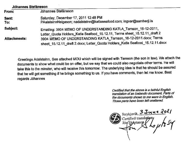 Degi síðar, 17. desember 2011, sagði Jóhannes svo í tölvupósti til Aðalsteins og Ingvars að til stæði að skrifa undir samkomulag við Tamson Hatuikulipi, tengdason Bernhards Esau sjávarútvegsráðherra, um væntanlega samvinnu þeirra.