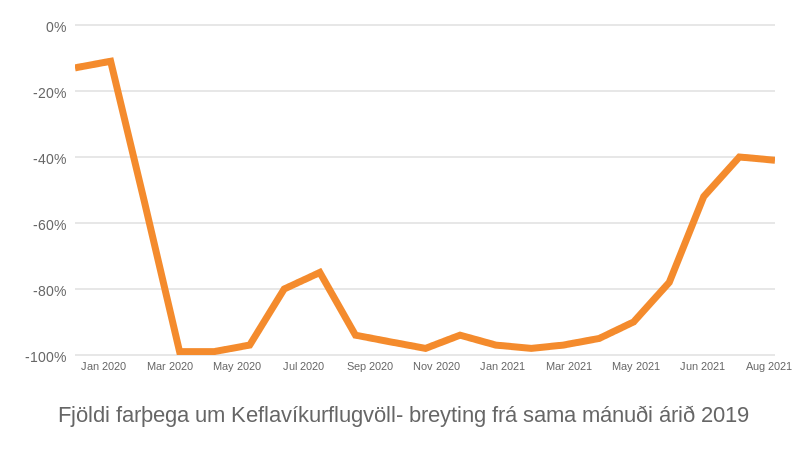 Samkvæmt nýbirtum tölum Ferðamálastofu um farþega um Keflavíkurflugvöll voru brottfarir þeirra um 108 þúsund talsins í síðasta mánuði, sem er ekki langt frá þeim mánaðarlega fjölda ferðamanna sem fór um flugvöllinn í byrjun árs 2020. Hins vegar vantar mikið upp á að fjöldinn komist aftur í eðlilegt horf ef leiðrétt er fyrir árstíðarsveiflum, en líkt og myndin hér að ofan fóru tæplega helmingi færri ferðamenn um flugstöðina í september heldur en í sama mánuði árið 2019.