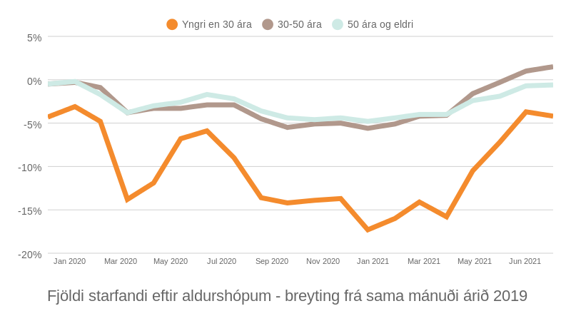 Sá aldurshópur sem hefur verið fljótastur að rétta úr kútnum er hópur starfsmanna á milli þrítugs og fimmtugs, en líkt og myndin sýnir starfa nú fleiri á þessu aldursbili heldur en gerðu árið 2019. Fjöldi starfsmanna yfir fimmtugu er sömuleiðis orðinn svipaður og hann var á sömu mánuðum fyrir tveimur mánuðum síðan. Hins vegar hefur hópur ungra starfsmanna ekki enn náð sér á strik. Samkvæmt tölum Hagstofu voru þeir 4 prósentum færri í síðasta ágústmánuði en þeir voru í sama mánuði árið 2019.