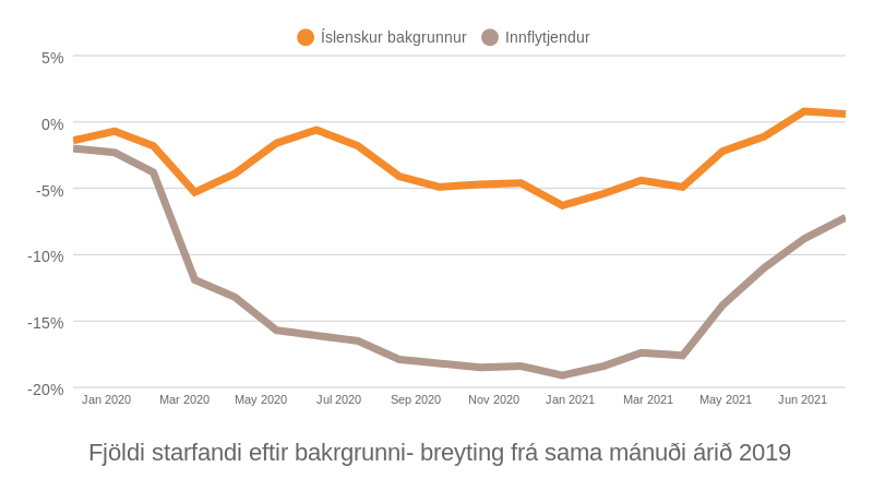 Starfsmenn með erlendan bakgrunn eru hins vegar langt frá því að vera orðnir jafnmargir og þeir voru áður en faraldurinn byrjaði, en þeim hefur fækkað um tæplega þrjú þúsund á sama tíma. Líkt og myndin hér að neðan sýnir jafngildir þetta sjö prósenta fækkun á starfandi innflytjendum frá sama mánuði árið 2019, á meðan starfandi fólki með íslenskan bakgrunn hefur fjölgað um tæpt prósent.
