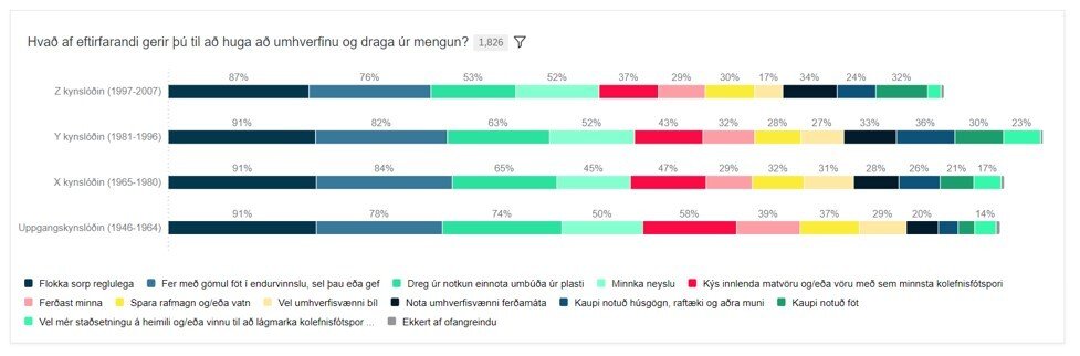 Samkvæmt kynslóðamælingu Prósents gerir Z-kynslóðin minnst, samanborið við aðrar kynslóðir, til að huga að umhverfinu og draga úr mengun. Mæling Prósents á Z-kynslóðinni nær til einstkalinga sem eru fæddir á milli áranna 1997-2007. 76 prósent þeirra fara með gömul föt í endurvinnslu, selja eða gefa, samanborið við 91 prósent eldri kynslóða. Z-kynslóðin kaupir hins vegar meira magn af notuðum fötum en hinar kynslóðirnar, eða 32 prósent.