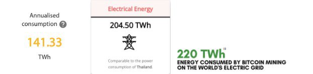 Samkvæmt greiningu Cambridge háskóla nemur orkuþörf Bitcoin rúmlega 140 teravattstundum (TWst) á ársgrundvelli. Digiconomist, sem vekur athygli á umhverfisáhrifum rafmynta, áætlar að orkunotkunin nemi um 204 TWst og Bitcoin Mining Council, vettvangur fyrirtækja sem sinna Bitcoin námugrefti, telur orkunotkunina nema um 220 TWst.