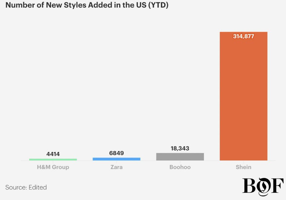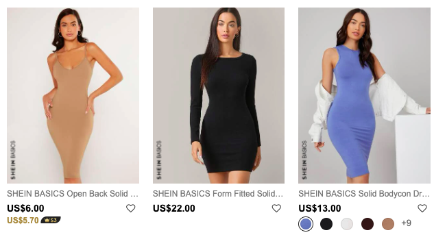 Shein býður upp á öll heitustu „trendin“ á ómótstæðilegu verði. Úrvalið af fatnaði og fylgihlutum er margfalt meira en almennt gerist en á hverjum degi bætir Shein við 2.000 til 10.000 nýjum flíkum og tískuvarningi á heimasíðu sína. Á þriggja mánaða tímabili, frá janúar til apríl 2022, bætti Shein við 315.000 nýjum vörum á heimasíðu sína. Til samanburðar bætti H&M „einungis“ við 4.400 nýjum vörum.