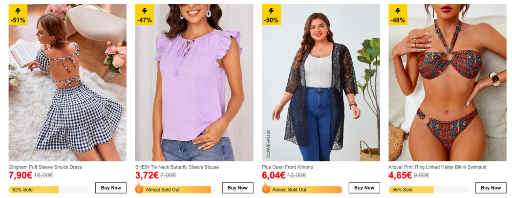Fyrir utan stöðugt flæði af hræódýrum fötum eykur Shein stöðugt framboð á klæðnaði á útsölu. Fyrirtækið heldur reglulega svokallaðar skyndiútsölur (e. flash sales). Skyndiútsölur virka þannig að takmarkað framboð af vörum er á útsölu í takmarkaðan tíma. Útsölutíminn er sýndur efst á heimasíðunni í klukkutímum, mínútum og sekúndum.