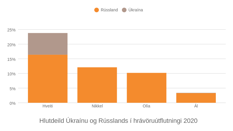 Bæði Rússland og Úkraína eru mikilvægir hráefnisframleiðendur. Líkt og myndin hér að neðan sýnir komu 24 prósent af öllum hveitiútflutningi frá löndunum tveimur árið 2020, auk þess sem þau áttu tólf prósenta hlutdeild í öllum útflutningi á nikkel, tíu prósent af útflutningi olíu og þrjú prósent af öllum álútflutningi.