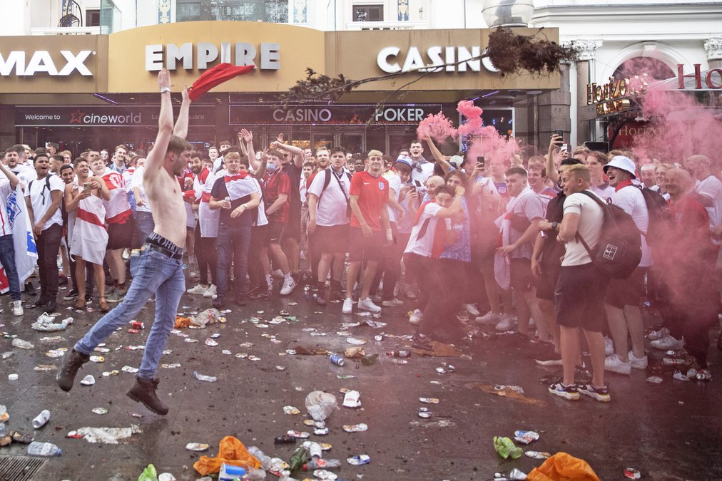 Fyrir utan var fólk löngu farið að safnast saman. Drekka. Og drekka. Takmarkanir vegna COVID-19 höfðu verið útfærðar með þeim hætti að um 65 þúsund áhorfendur yrðu á Wembley um kvöldið. Það þýddi að um fjórðungur sætanna var tómur.