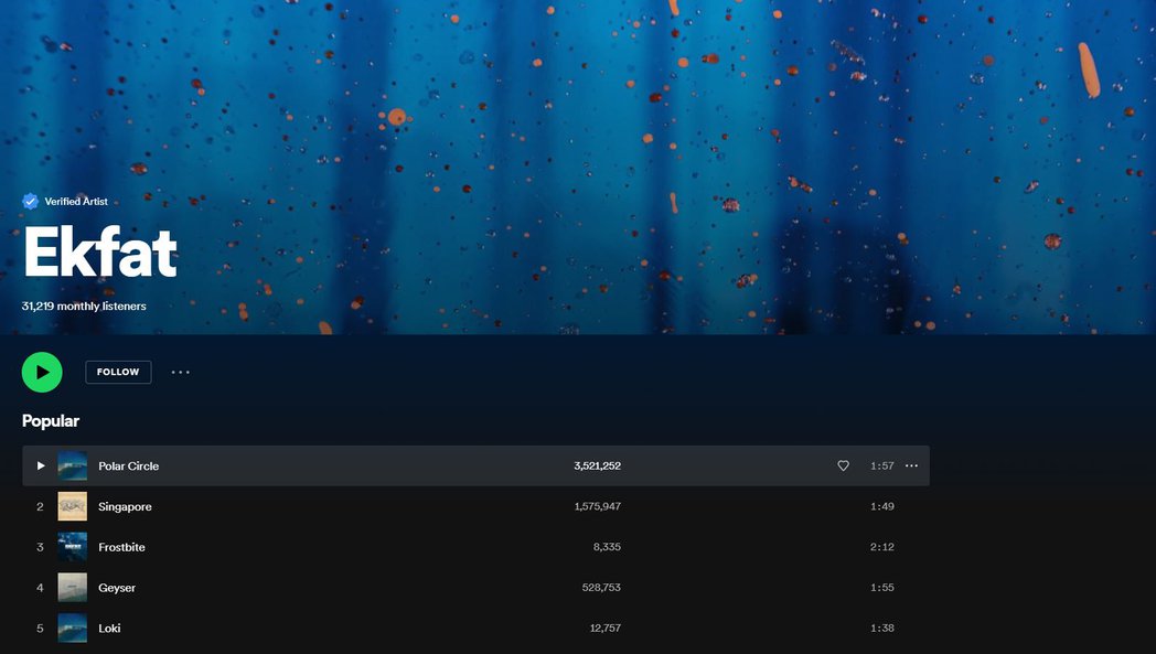 Íslenski listamaðurinn Ekfat er í hópi rúmlega 800 listamanna á Spotify sem Dagens Nyheter fjallaði um í fréttaskýringu nýverið þar sem í ljós kemur að listamennirnir eru í raun og veru ekki til en sænskt útgáfufyrirtæki, Firefly Entertainment, hagnast á tónlist í þeirra nafni á Spotify. Fyrirtækið hefur tífaldað tekjur sínar á skömmum tíma og hefur um langa hríð átt í nánum samskiptum við starfsmann í stjórnendateymi Spotify.
