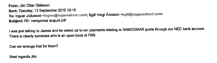 Í greinargerð sem ríkissaksóknari í Namibíu sendi frá sér í lok júlí síðastliðins voru birtir tölvupóstar sem Jón Óttar sendi úr netfangi dótturfélags Samherja 13. september 2016 til tveggja annarra manna sem hafa réttarstöðu sakbornings í málinu, Ingvars Júlíussonar og Egils Helga Árnasonar. Þar sagðist hann meðal annars hafa verið að ræða við einn þeirra sex manna, James Hatuikulipi, sem sitja í fangelsi í Namibíu vegna gruns um að þiggja mútur frá Samherja, í tengslum við greiðslur fyrir kvóta frá fyrirtækinu Namgomar, sem Samherji fékk kvóta frá á grundvelli milliríkjasamnings við Angóla.