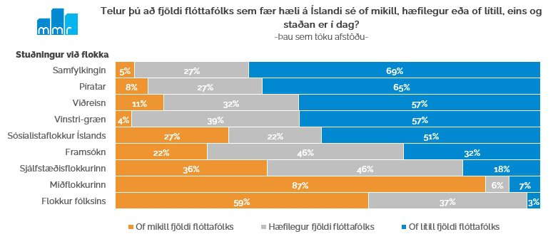 Framsóknarflokkurinn er síðan, eins og í mörgum öðrum málum, mitt á milli samstarfsflokka sinna í ríkisstjórn, en 32 prósentum þeirra sem sögðust ætla að kjósa flokkinn finnst tekið á móti of fáum flóttamönnum og 22 prósentum finnst tekið á móti of mörgum, samkvæmt könnun MMR.