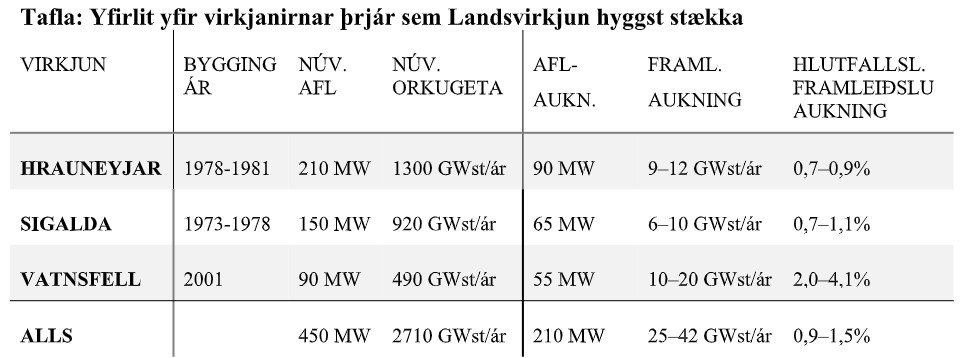 Samtals hyggst Landsvirkjun auka uppsett afl virkjananna þriggja um 210 MW en áætlað er að samanlögð orkuvinnslugeta myndi með þessu aðeins aukast um 25–42 gígavattstundir (GWst) á ári.