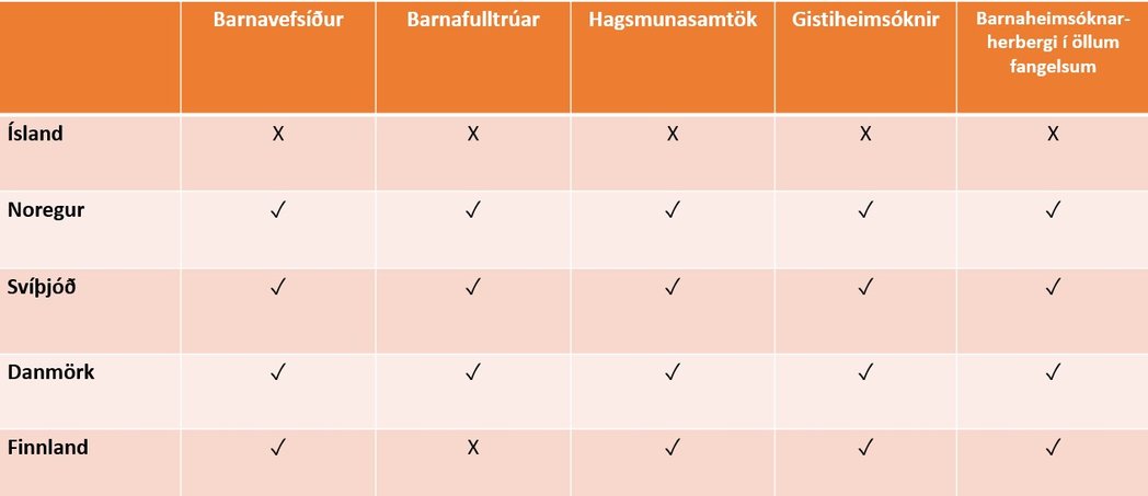 „Löggjöf og framkvæmd Norðurlandanna á sviði fullnustu refsinga er sambærileg að mörgu leyti,“ sagði Lilja Katrín. Misjafnt er vissulega hversu mikil áhersla er lögð á réttindi barna fanga „en það er þó ljóst að staða þessa hóps er hvað veikust á Íslandi“.