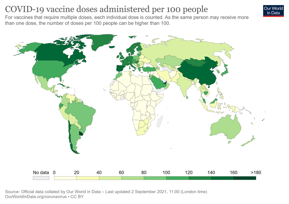 Um 5,4 milljarðar skammtar af bóluefni gegn COVID-19 hafa verið gefnir á heimsvísu og 40 prósent jarðarbúa hafa fengið að minnsta kosti einn skammt. Þetta hefur tekist að gera á aðeins nokkrum mánuðum. En þegar tölfræðin er brotin niður eftir heimshlutum blasir við óhugnanleg staðreynd: 75 prósent allra þessara skammta hafa verið gefnir íbúum tíu ríkustu þjóða heims. Þær og efnameiri þjóðir eru margar hverjar komnir vel yfir 50 prósent bólusetningarhlutfall. Aðeins 1,8 prósent íbúa fátækustu ríkjanna hafa á sama tíma fengið einn skammt eða tvo.