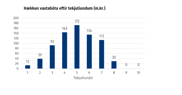 Í svari ráðuneytisins segir að tekjur heimila vegna vaxtabóta, sem hafa farið hratt lækkandi á undanförnum árum, hafi verið tveir milljarðar króna í fyrra. Miðað við þá tölu myndu tekjur heimila aukast um 700 til 800 milljónir króna ef eignaskerðingarmörkin yrðu hækkuð um 50 prósent. Sú upphæð myndi að stærstum hluta lenda hjá millitekjuhópum, tekjutíundum fjögur til sex, en efstu tekjutíundirnar tvær myndi ekki fá neitt í sinn hlut.