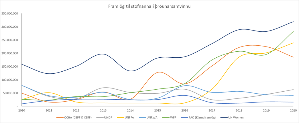 Þannig hafa framlög Íslands til nokkurra alþjóðastofnana, meðal annars áherslustofnana Íslands á sviði mannúðar og þróunarsamvinnu, aukist jafnt og þétt undanfarinn áratug. Meðal áherslustofnana eru þróunaráætlun SÞ (UNDP), samræmingarskrifstofa SÞ í manníðarmálum (OCHA), mannfjöldasjóður SÞ þjóðanna (UNFPA), Palestínuflóttamannaaðstoðin (UNRWA), matvælaáætlun SÞ, auk FAO og UN Women.