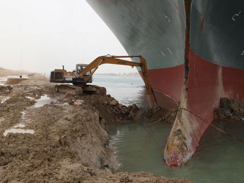Til að koma í veg fyrir að Súes-skurðurinn yrði hinsti hvílustaður þess var óðara kölluð út aðstoð. Bubbi byggir mætti á gröfunni sinni og kepptist við að moka sandi frá stefni þess.
