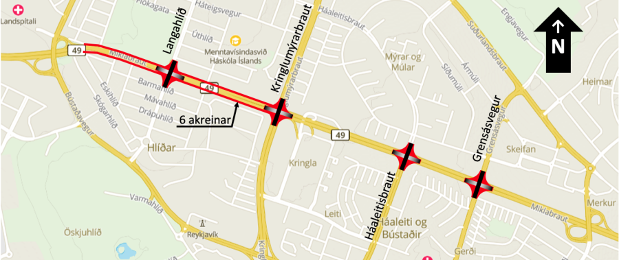 Er þessi vegarspotti væri ekinn úr vestri væri gert ráð fyrir fjórum nýjum mislægum gatnamótum austur að Grensásvegi. Þau fyrstu yrðu við Lönguhlíð, svo yrði farið um mislæg gatnamót við Kringlumýrarbraut, síðan við Háaleitisbraut og að lokum yrðu byggð mislæg gatnamót við Grensásveg. Þá gæti bílaumferðin runnið áfram án þess að nokkru sinni þyrfti að stöðva á rauðu ljósi.