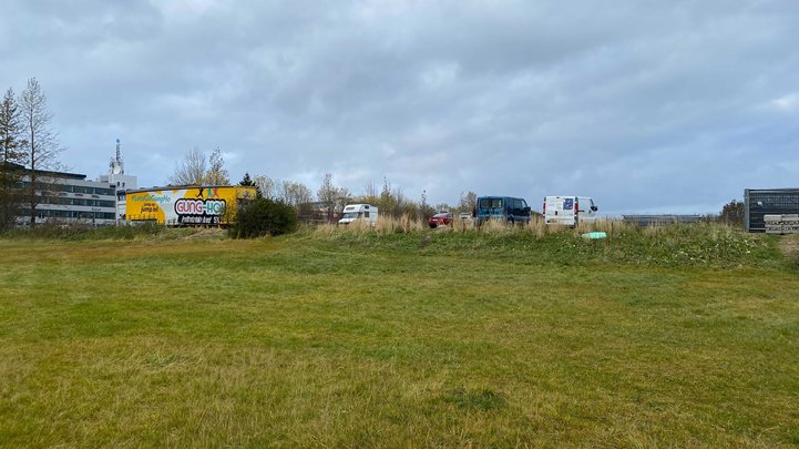 Ögn vestar er síðan illa hirt og holótt bílastæði, þar sem auk annars stóð gámur, tveir sendibílar, einhver húsbíll án bílnúmera og vöruflutningagámur merktur Gung-Ho, sem í sumar var með stærðarinnar hoppukastalaþrautabraut á svæðinu. Á bílastæðinu voru einnig einhverjar járngrindur, sem líklega voru nýttar í tengslum við starfsemi hoppukastalans stóra.