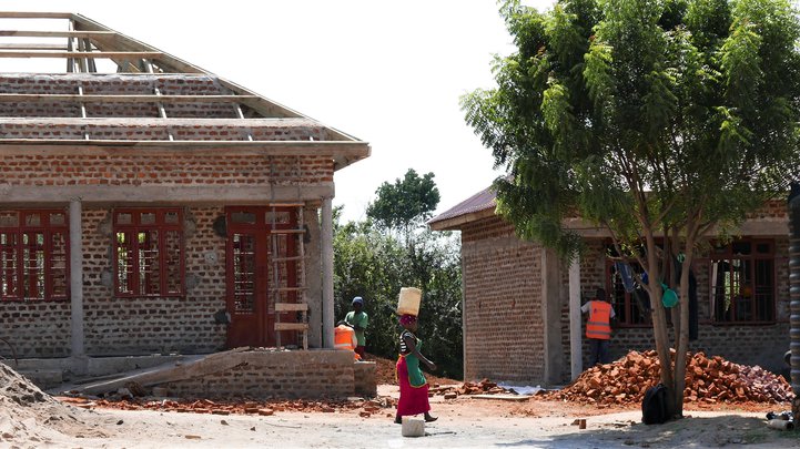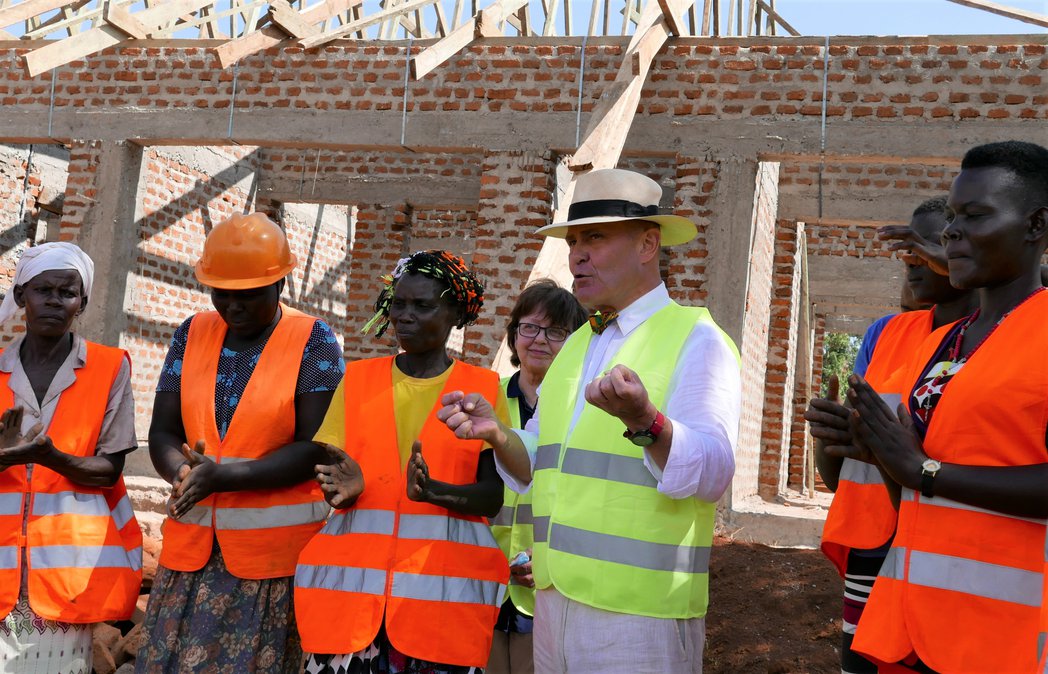 „Konur sem geta borið 20 lítra af vatni á höfðinu dagana út og inn geta borið múrsteina,“ segir hann þegar allir byggingarstaðirnir hafa verið afhentir verktökunum og ökuferðin um holóttu vegina í sveitinni í átt til höfuðborgarinnar Kampala er hafin.