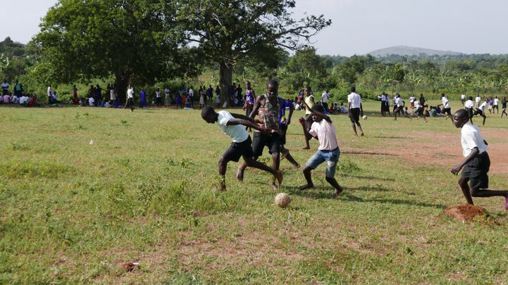Skólabjalla glymur við Busiro-skóla. Bjallan er felga sem slegið er í með trésleif. Börnin koma hlaupandi inn í kennslustund frá því að spila fótbolta úti á túni. Spörkuðu berfætt á milli sín hálfloftlausri leðurtuðru en með reglur leiksins á hreinu: Tóku innköst og markspyrnur.