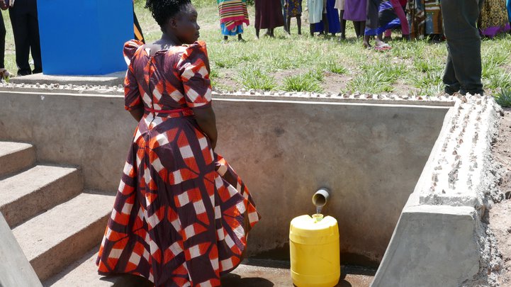 „Í þessu samfélagi höfum við glímt við margar hindranir í tengslum við vatnsöflun,“ segir Annet Nakesa. Hún gengur með stóran, gulan brúsa að vatnsbóli rétt við þorpið sitt. Áður var þar forarleðja og ausa varð brúnleitu vatninu upp í brúsana til að fylla þá. Annet gengur nú niður steinsteyptar tröppur og kemur brúsanum fyrir undir kröftugri bunu af hreinu vatni.
