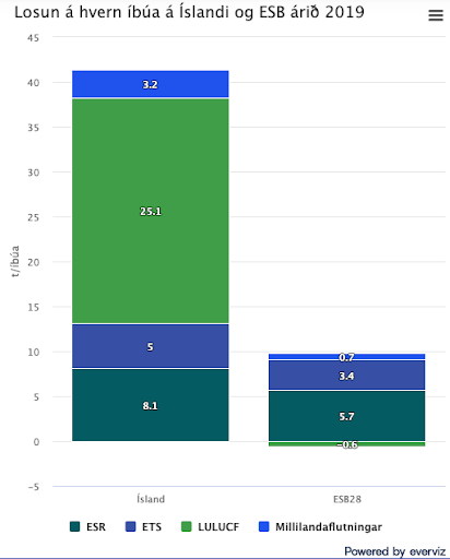 Árið 2019 var losun á hvern íbúa án LULUCF 13,1 tonn hérlendis en 9,1 innan ESB. Þar af nam losun á beinni ábyrgð stjórnvalda (ESR) 8,1 tonni á hvern íbúa hérlendis en 5,7 tonnum á hvern íbúa innan ESB. Losun vegna þungaiðnaðar, þ.e. sú losun sem fellur undir ETS kerfið, nam 5 tonnum á hvern íbúa hérlendis en 3,4 tonnum á hvern íbúa innan ESB. Mestu munar um losun vegna landnotkunar. Heildarlosun með LULUCF er um 38,2 tonn á hvern íbúa hérlendis en 8,5 tonn á hvern íbúa í ESB.