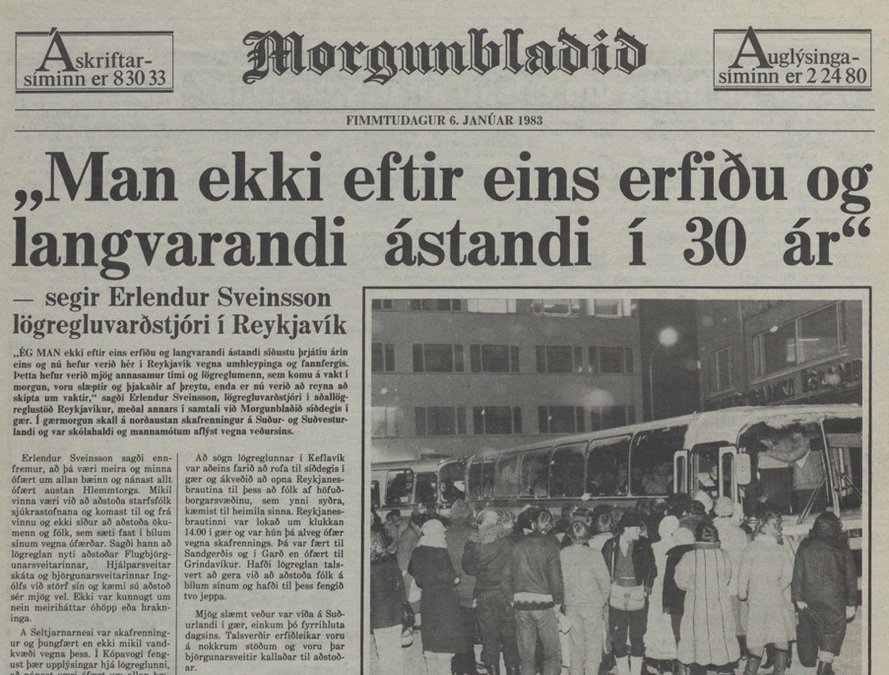 Eitthvað þessu líkt gerðist hér fyrir 40 árum, 3. til 5. janúar 1983, og verst að morgni þess 4. Flest fór úr skorðum og samfélagið suðvestanlands hálf lamaðist þarna fyrstu vinnudagana eftir áramót. Veðráttan, tímarit Veðurstofunnar, fer um þetta nokkuð hlutlausum orðum, en þar segir: „Gerði ófærð í Reykjavík og nágrenni og 4. og 5. Voru miklir umferðarörðugleikar um allt sunnan- og vestanvert landið. Tveir menn slösuðust þegar verið var að draga bíla úr sköflum. Fólk átti í erfiðleikum með að komast til og frá vinnu og mjólkurflutningar fóru úr skorðum.“