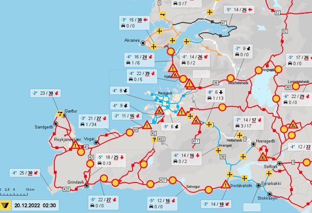 Við áttum okkur nú á hvað við er að eiga þegar saman fer hvass vindur og blinda í skafrenningi. Á Reykjanesbrautinni var nóg að vindur færi úr 10 í 15 m/s aðfaranótt 19. desember, svo að allt færi í steik og það aðeins á 1 til 2 klukkustundum. Fram að því í strekkingsvindinum náðist að halda í horfinu. Bílar sem skildir voru eftir á Grindavíkurvegi eða Reykjanesbrautinni voru líka fljótir að fenna í kaf við þessar aðstæður. Engin snjóruðningstæki ráða við slíkt ástand og að auki fennir mjög fljótt að gatnamótum við þessar aðstæður, ekki síst þar sem þau eru tekin niður, eins t.d. var raunin við Grindavíkurafleggjarann.