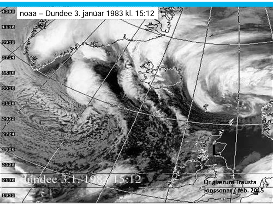 Trausti Jónsson veðurfræðingur rifjaði upp í stuttu erindi á Fræðaþingi veðurfræðifélagsins fyrir nokkrum árum hvernig tilfinning það hefði verið að mæta með veðurspá í sjónvarpi að kvöldi 3. janúar 1983. Sjónvarpskortið gamla úr hans fórum sýnir tvenn kuldaskil eða snjókomubakka. Tunglmyndir voru mikilvægt tól í veðurspám á þessum árum. Voru reyndar fáar og bárust stundum of seint. Sú kl. 15:12 þann 3. janúar sýnir a.m.k. þrjá bakka og sá vestasti heldur ófrýnilegur. Með honum varð versti bylurinn í þessari syrpu morguninn eftir.